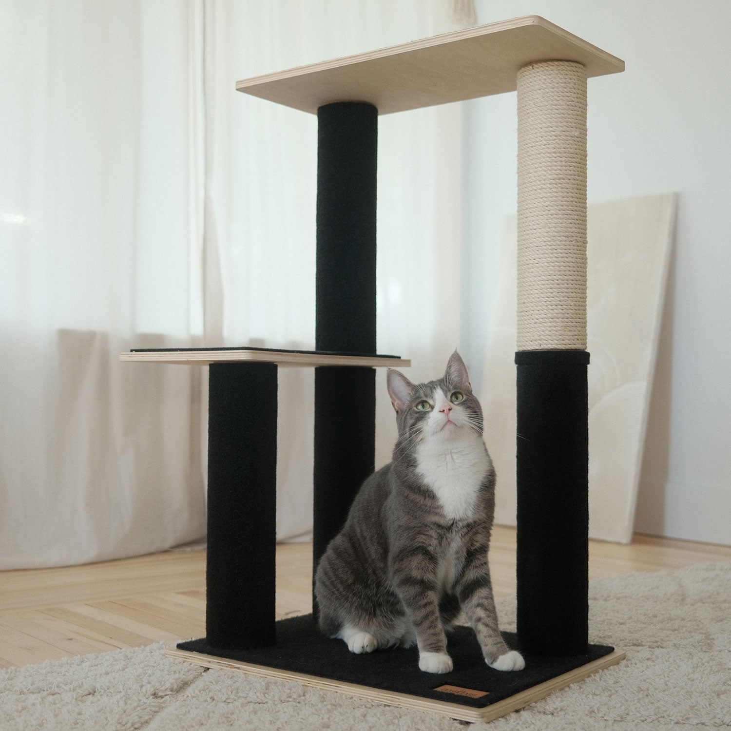 Each tier is covered with a sturdy felt carpet, ideal for both scratching and lounging. The felt provides a comfortable surface for your cat to rest while being durable enough to withstand daily scratching. The deep black felt contrasts beautifully with the natural wood, creating a visually striking piece that enhances any room.