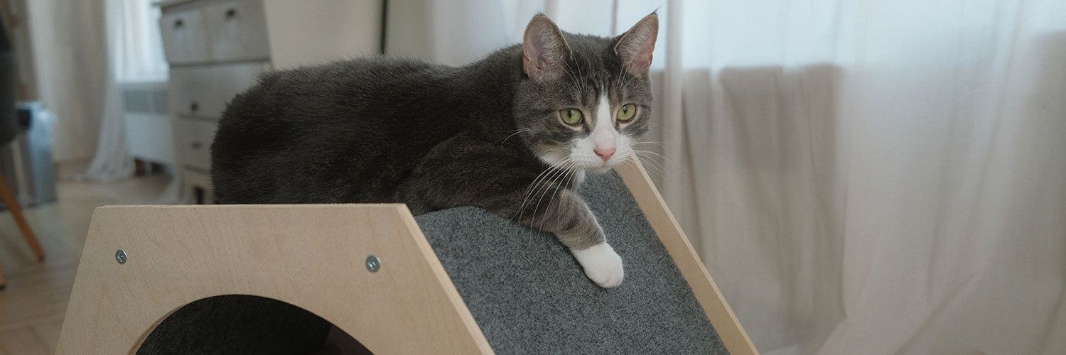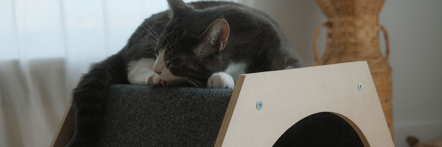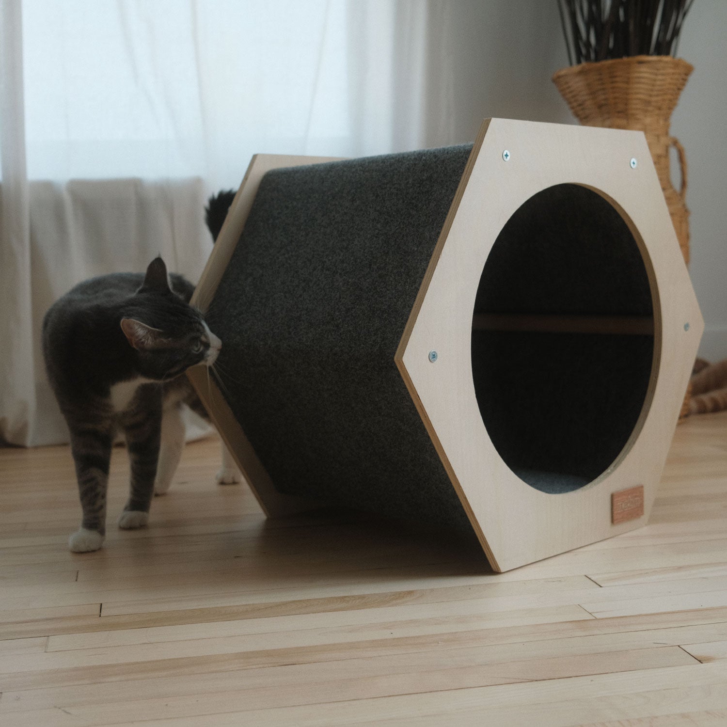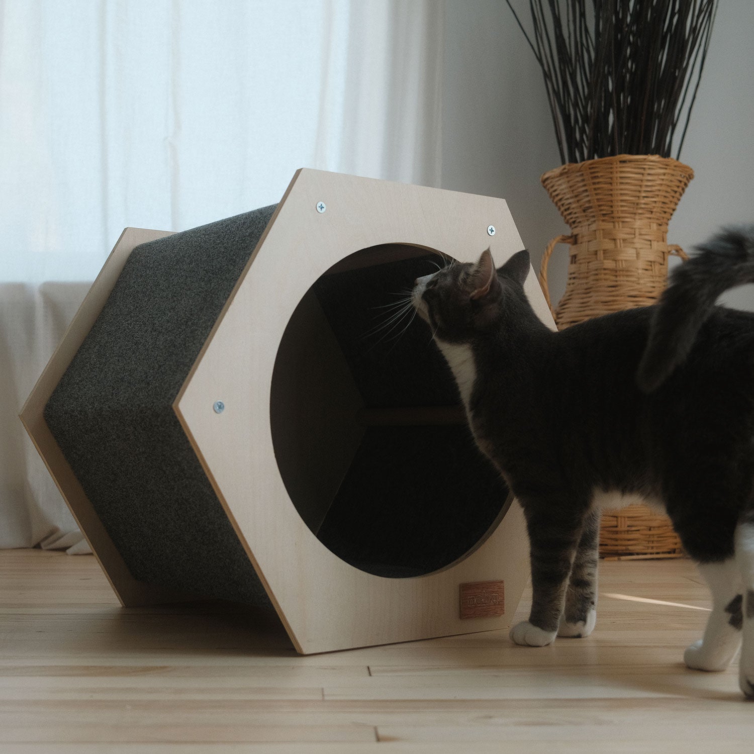 The Hexagon Scratchable cat House is the ultimate favorite spot for your pet. Made of sturdy Canadian wood, it offers a modern and minimalist design, and comes in 2 neutral colours. Its ultra resistant carpet is not only scratchable for an elegant alternative to cat trees and scratching posts, but also provides a cozy and comfortable resting place for your furry friend. Measuring 22 x 19 x 16 in / 56 x 48 x 41cm, it's the perfect addition to your home.