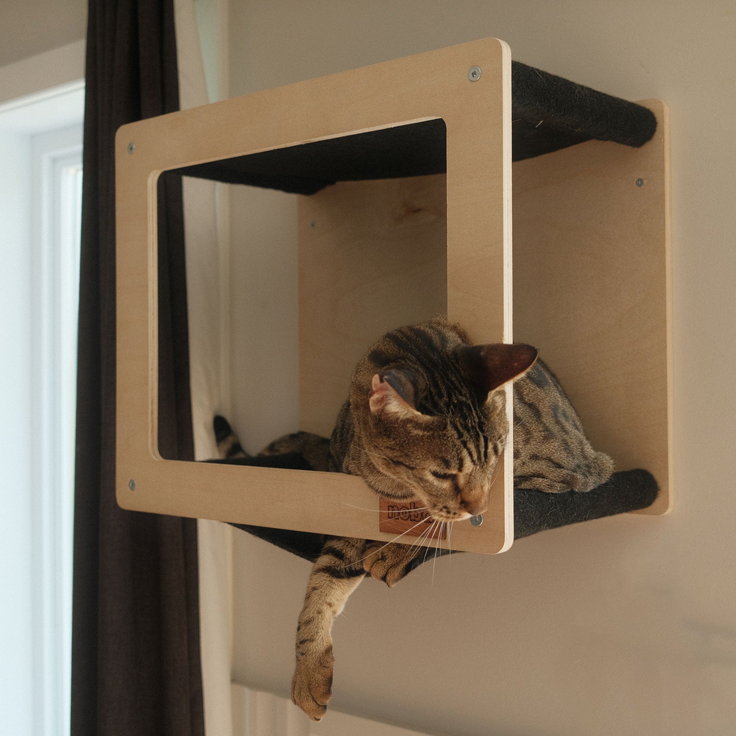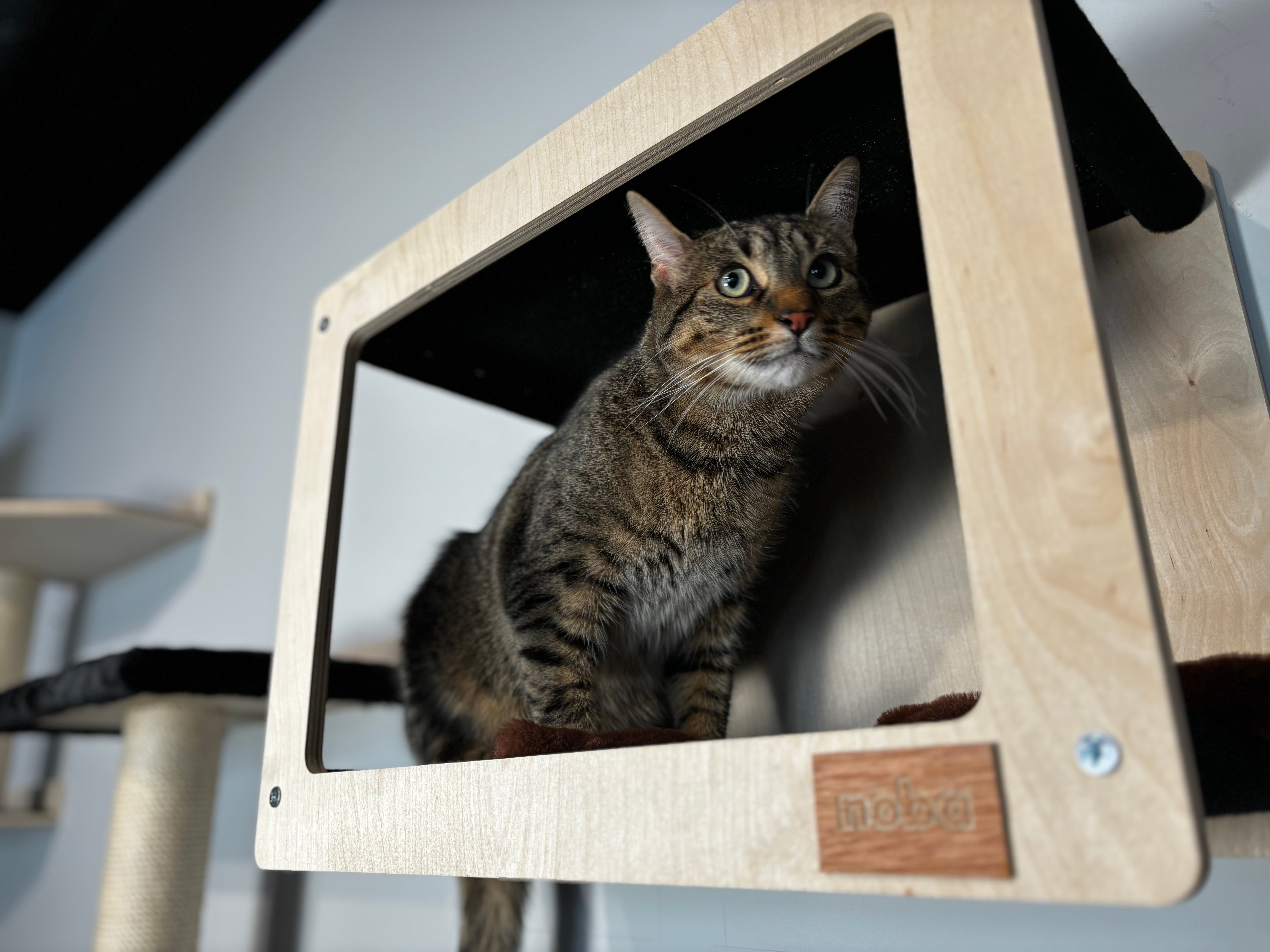 Create a cozy retreat for your cat with The HideoutSquare from The Mural Collection. This compact yet comfortable hideout provides the perfect nook for your cat to relax and unwind. Made with 2 Hammocks on top of each other, the high-grade plywood construction ensures durability, while the sturdy felt carpet interior offers comfort and 2 scratchable surfaces for your furry friend.
